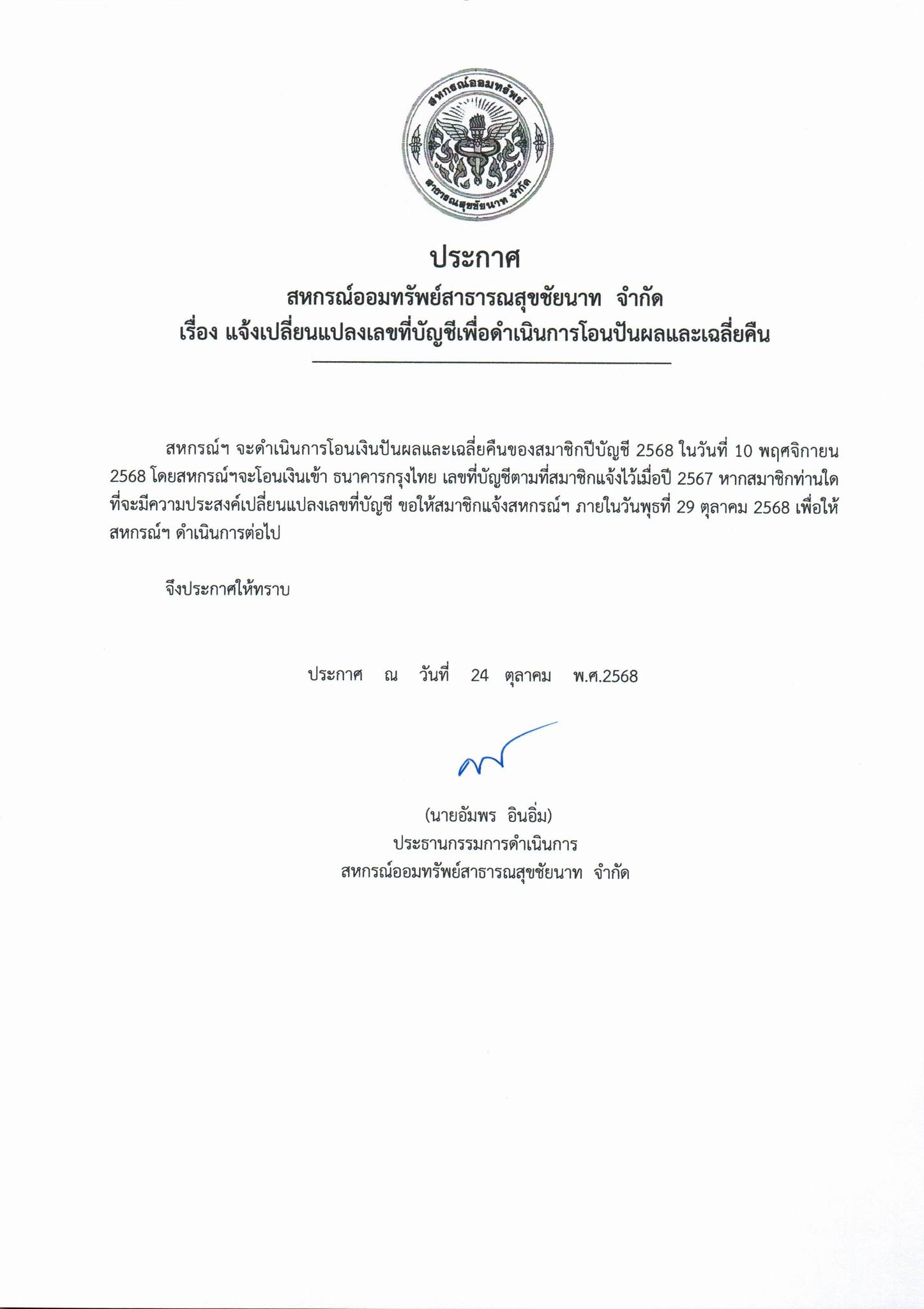 ประกาศ สหกรณ์ออมทรัพย์สาธารณสุขชัยนาท จำกัด เรื่อง แจ้งเปลี่ยนแปลงเลขที่บัญชีเพื่อดำเนินการโอนเงินปันผลและเฉลี่ยคืน ตุลาคม 25, 2025admincoopข่าวสารกิจกรรม FacebookTwitterGoogle PlusLine