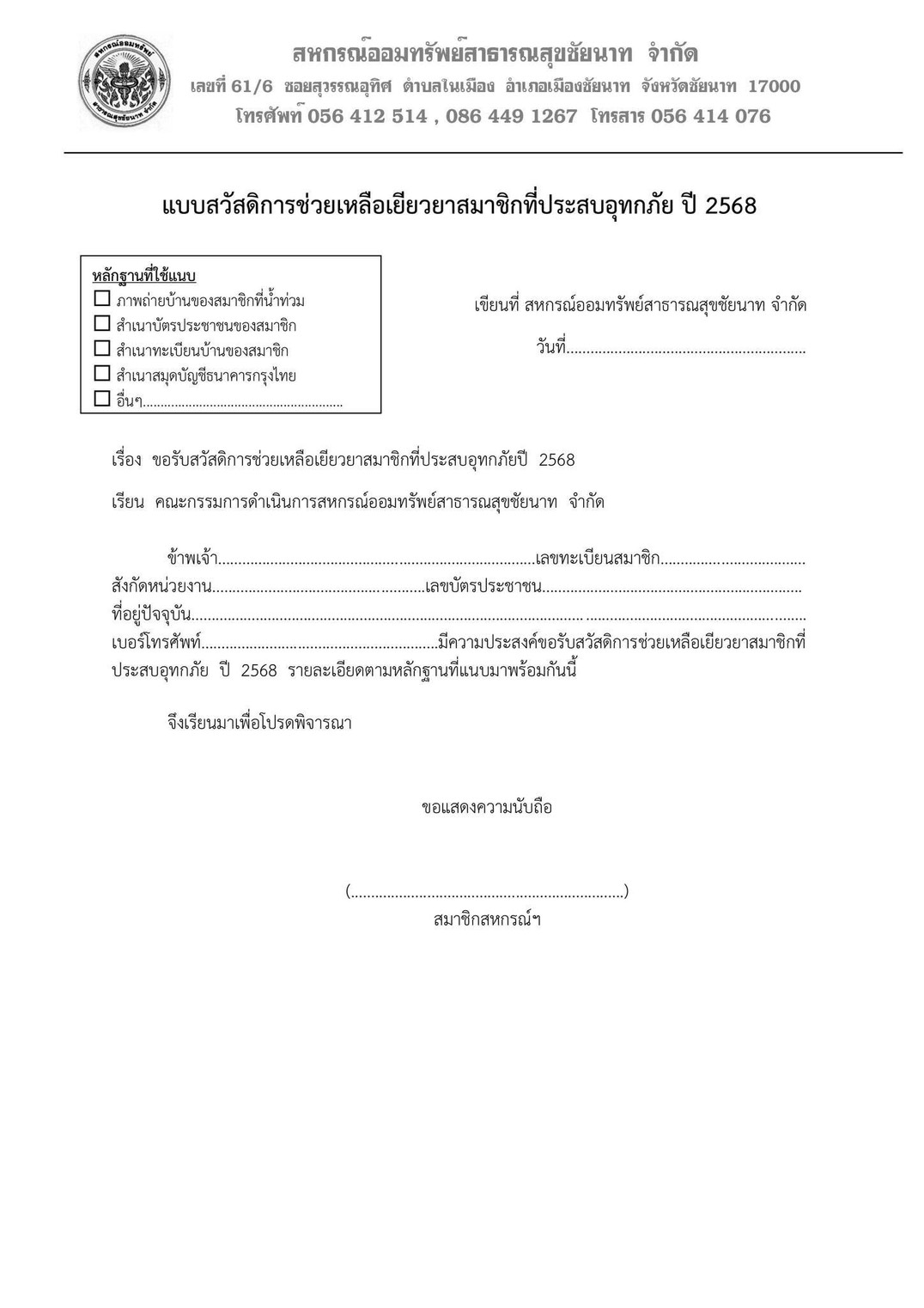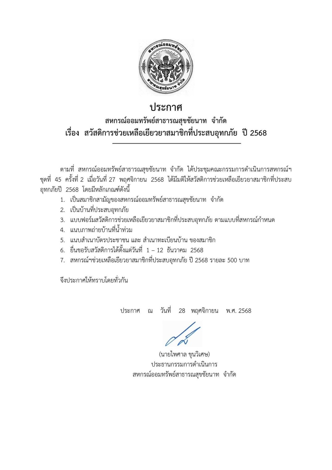 ประกาศ สหกรณ์ออมทรัพย์สาธารณสุขชัยนาท จำกัด เรื่อง สวัสดิการช่วยเหลือเยียวยาสมาชิกที่ประสบอุทกภัย ปี 2568 พฤศจิกายน 28, 2025ธันวาคม 8, 2025admincoopข่าวสารกิจกรรม >>>>> แบบฟอร์มสวัสดิการช่วยเหลือเยียวยาสมาชิกที่ประสบอุทกภัย ปี 2568 <<<<< FacebookTwitterGoogle PlusLine