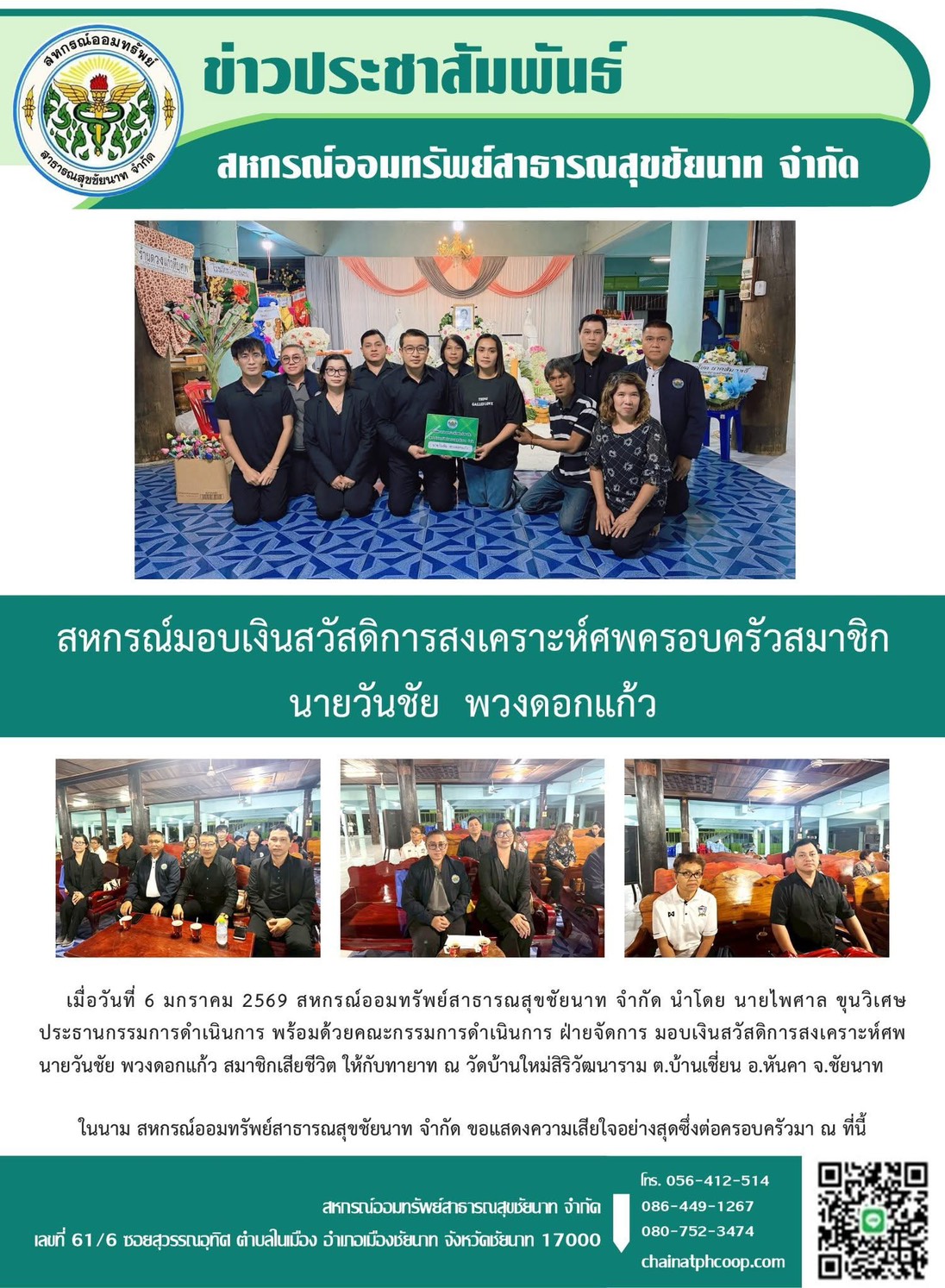 สหกรณ์มอบเงินสวัสดิการสงเคราะห์ศพครอบครัวสมาชิก