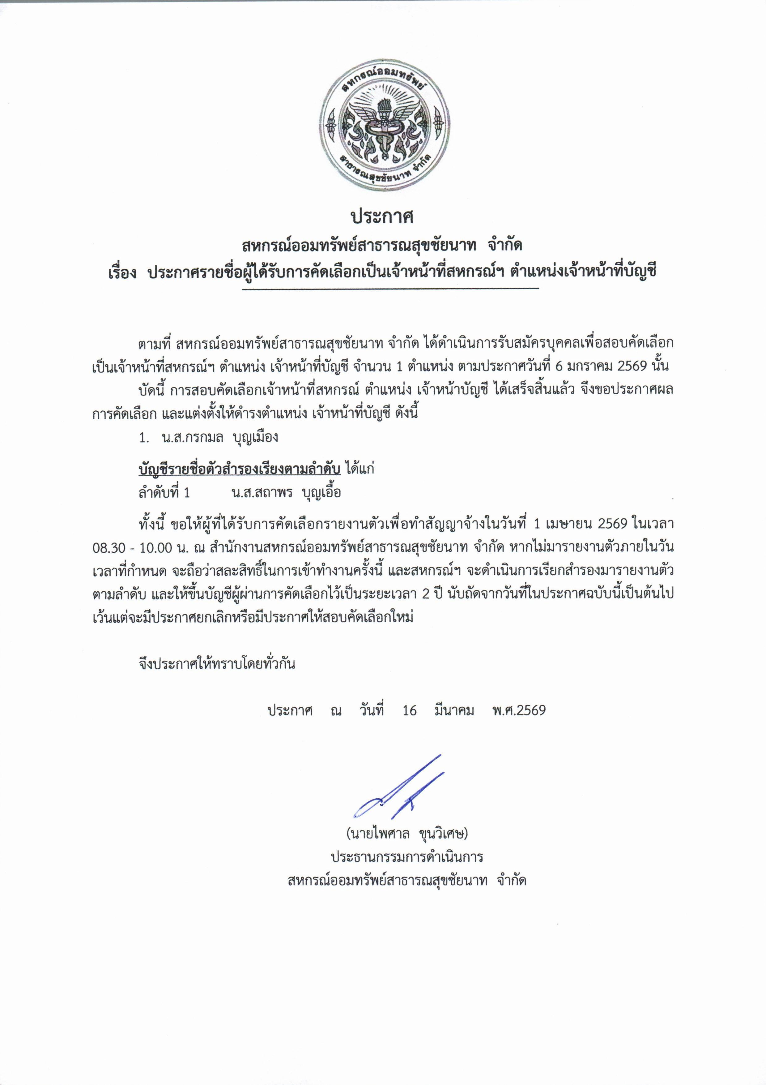 ประกาศ สหกรณ์ออมทรัพย์สาธารณสุขชัยนาท จำกัด เรื่อง ประกาศรายชื่อผู้ได้รับคัดเลือกเป็นเจ้าหน้าที่สหกรณ์ฯ ตำแหน่งเจ้าหน้าที่บัญชี มีนาคม 16, 2026มีนาคม 16, 2026admincoopข่าวสารกิจกรรม FacebookTwitterGoogle PlusLine